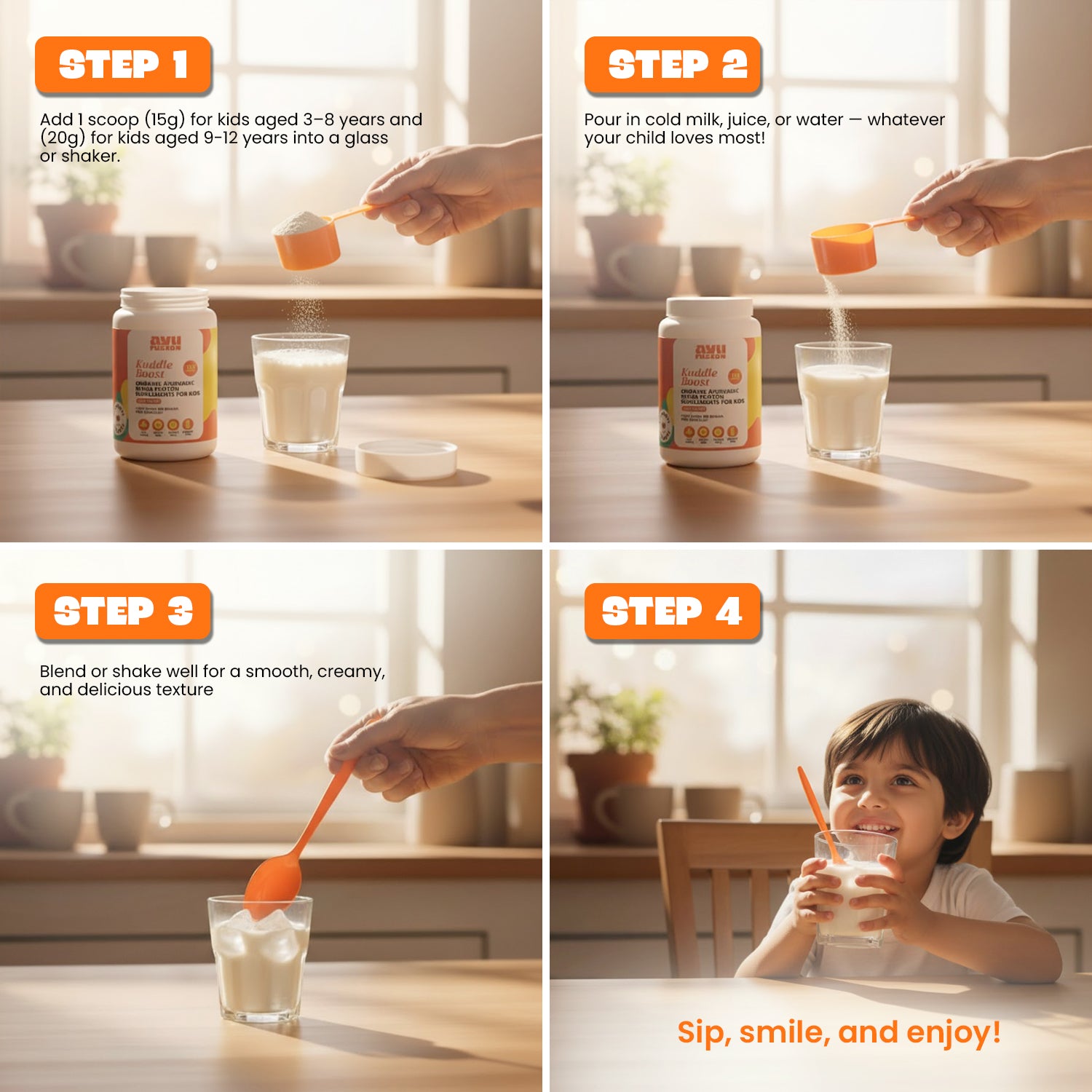 Sip, smile, and enjoy! Your child’s daily Kuddle Boost meal is ready tasty, healthy, and full of natural power!